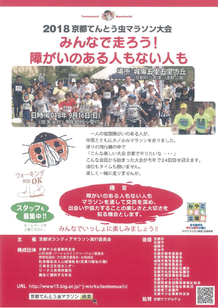 京都てんとう虫マラソン大会のメインスポンサーをつとめています。障がいのある人もない人もマラソンを通して交流を深め、お互いを理解し、出会い・努力する大切さと楽しさを知る機会となっています。
